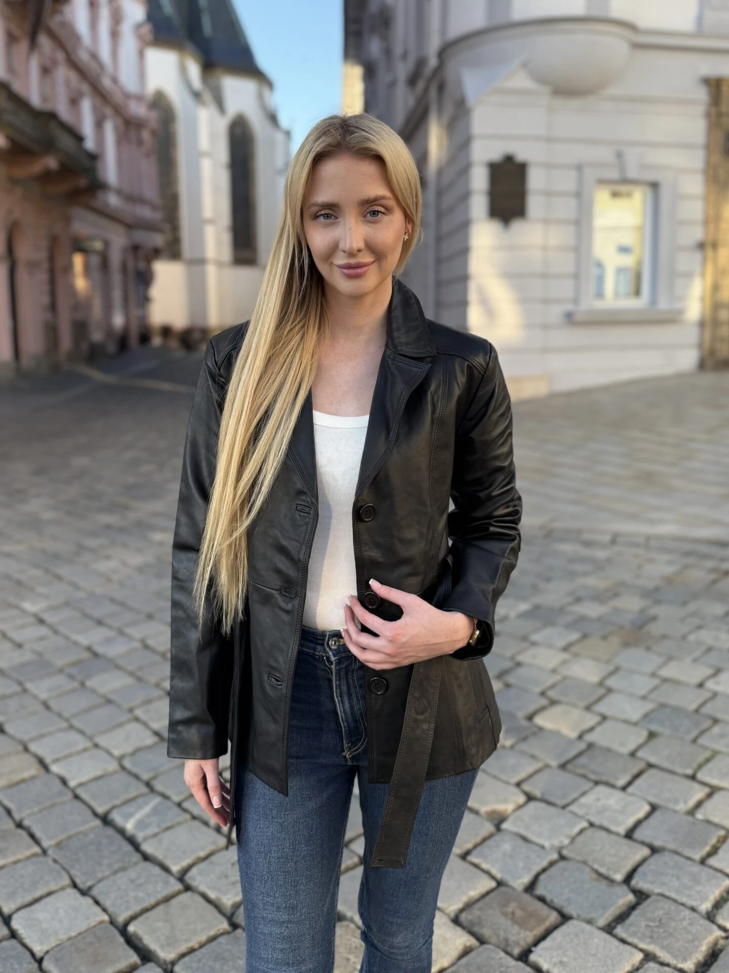 Kožený černý kabátek Paola má dvě boční kapsy, tři knoflíky na zapínání a stylový pásek. Mimochodem, Paola je ušita z velmi kvalitní jehnětiny.