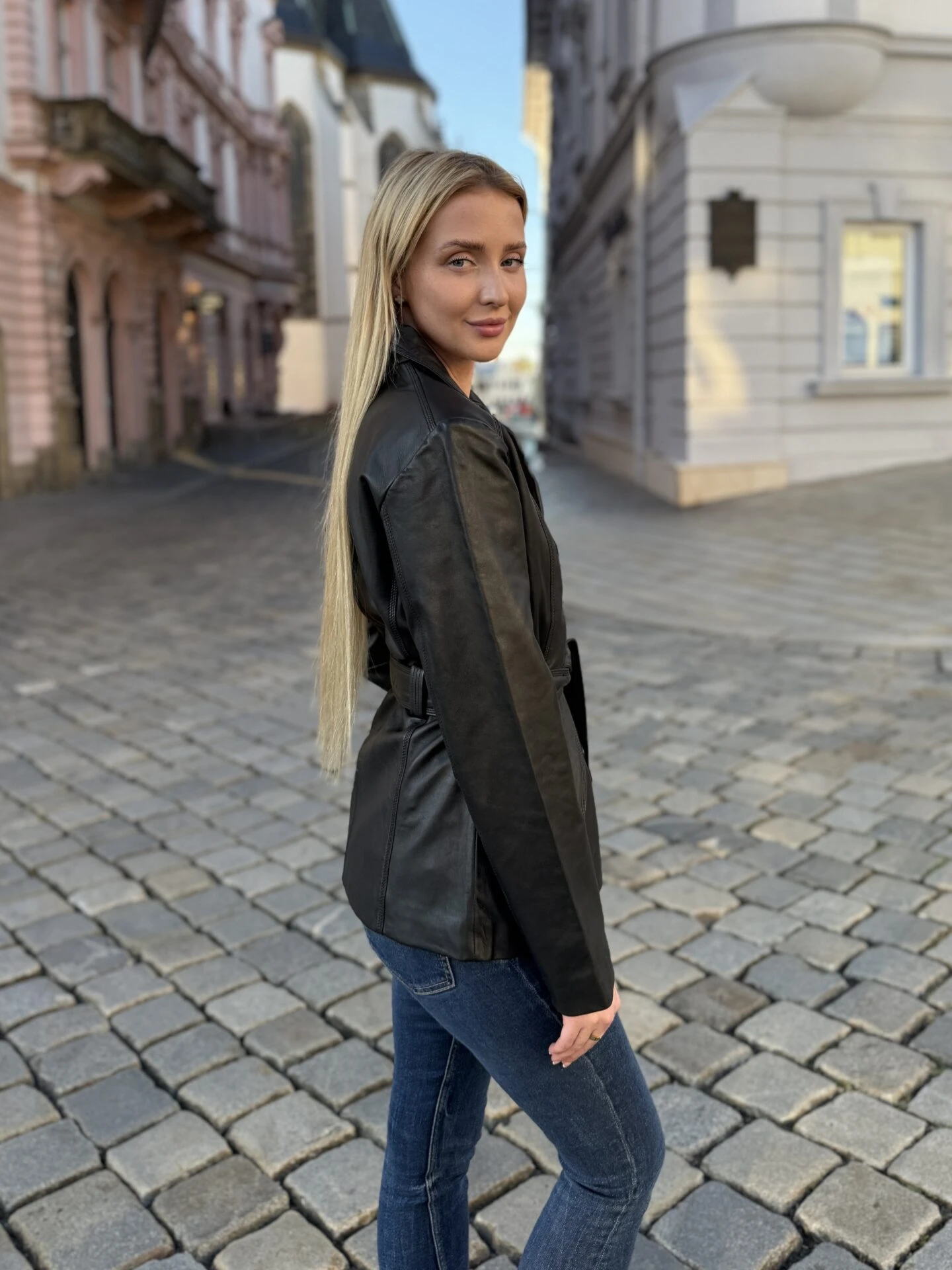 Kožený černý kabátek s límcem, páskem a zapínáním na knoflíky. Jednoduchý vypasovaný střih podtrhuje ženskou siluetu a půvab. Délka do půlky boků celý koncept odlehčuje. Tenhle kabátek jménem Paola proto vyjadřuje jistou hravost a také radost z umění být krásnou.