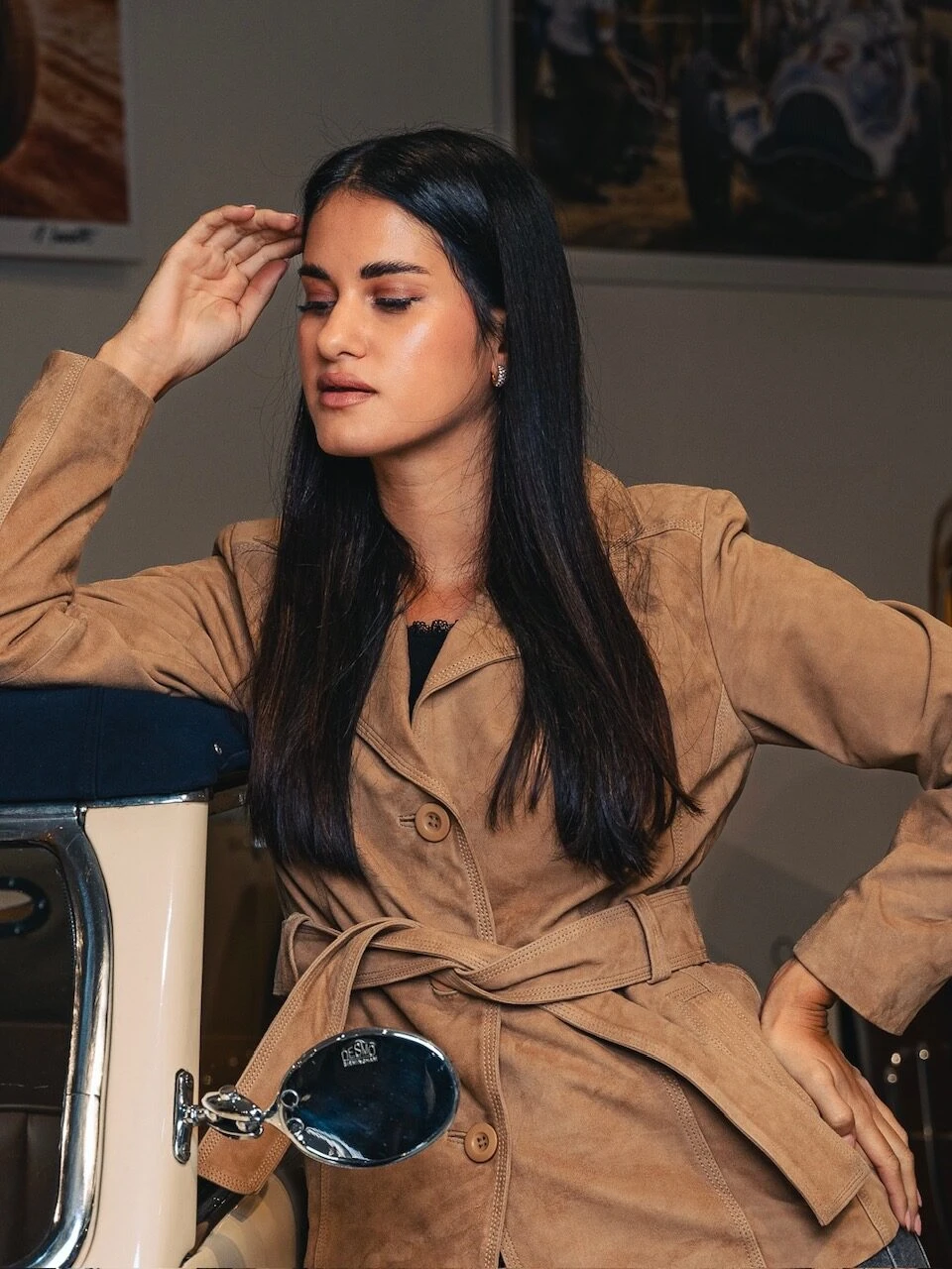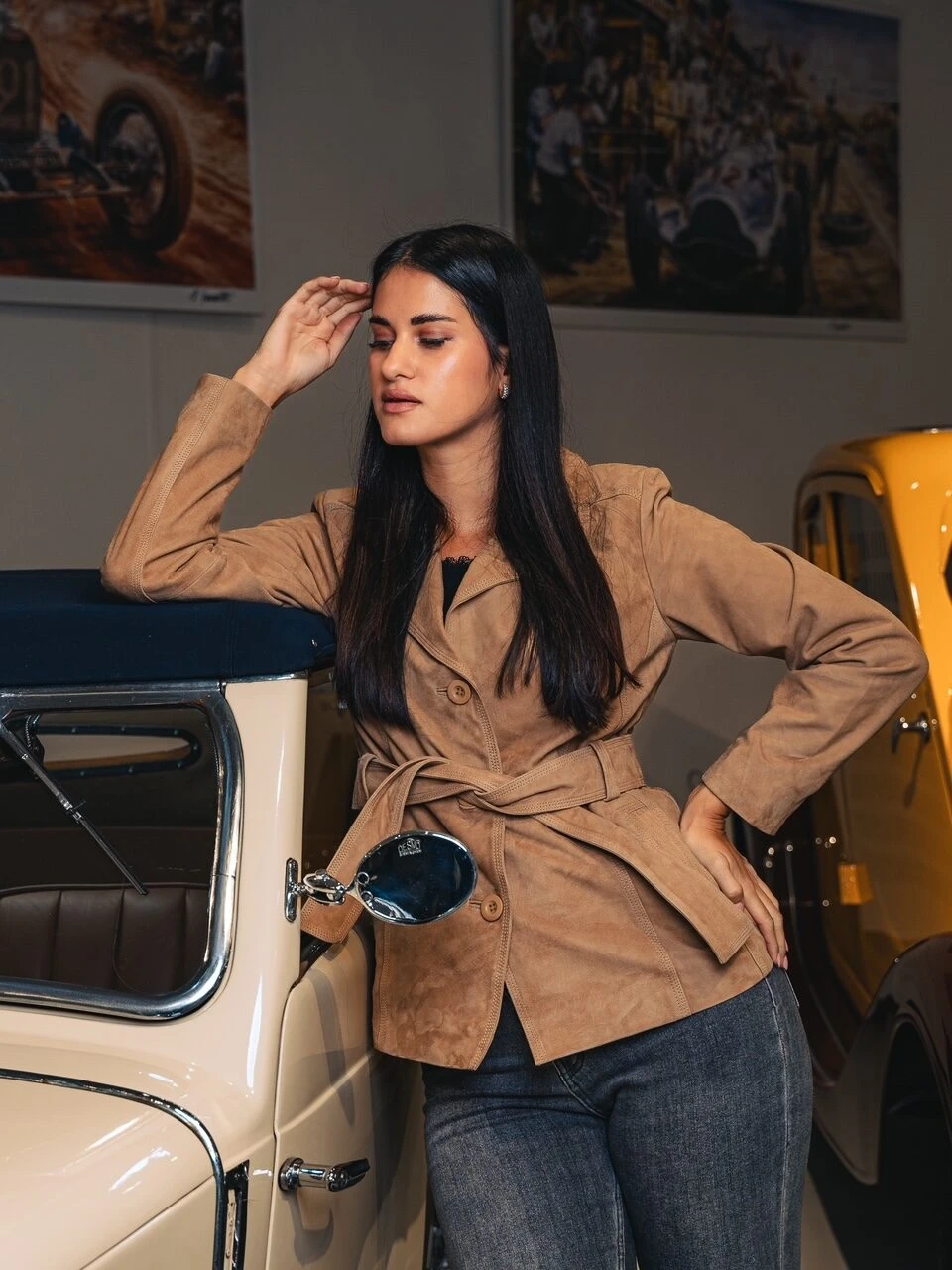 Paola Suede Sand – Kožený kabátek s páskem semiš písková barva