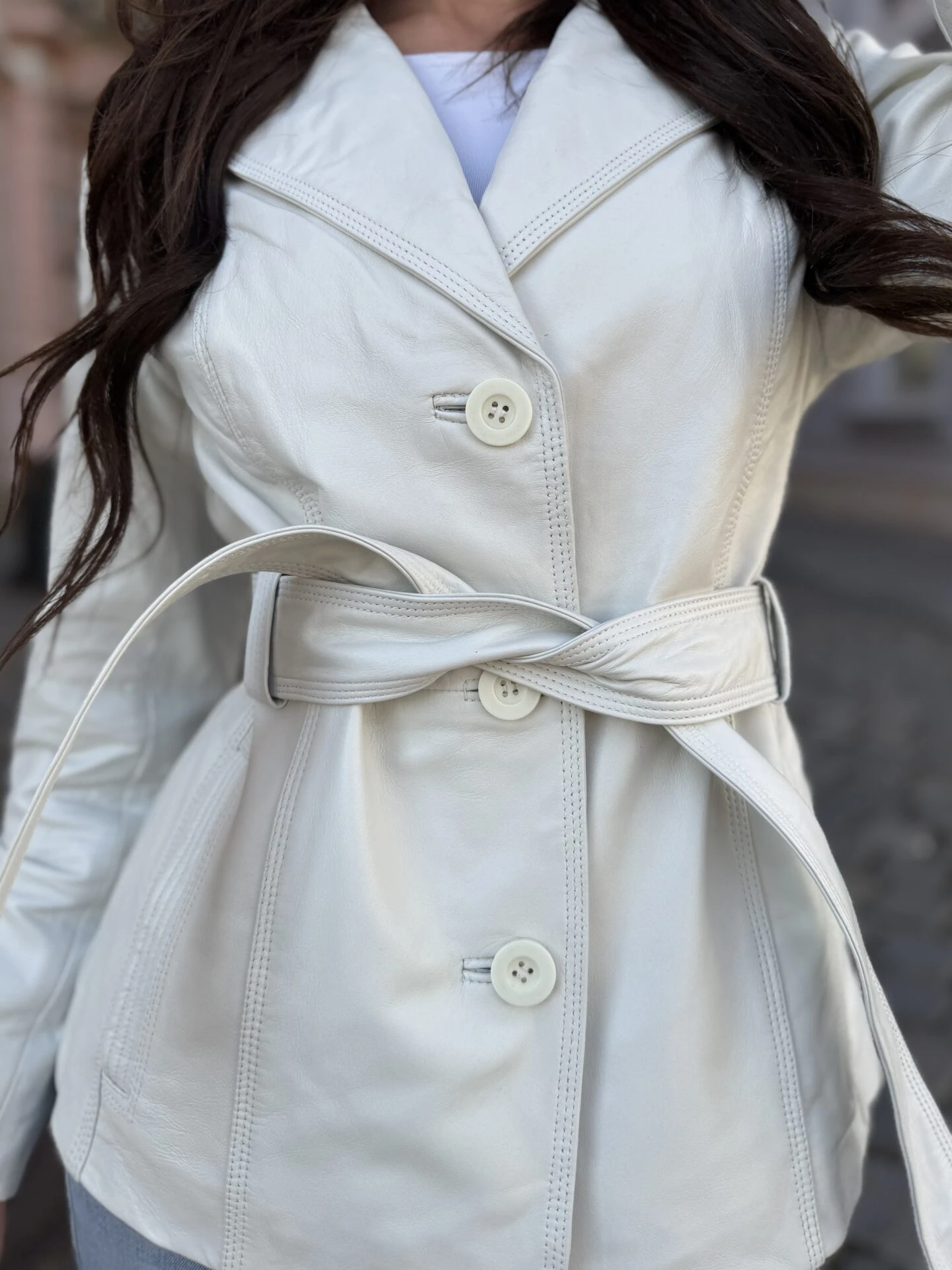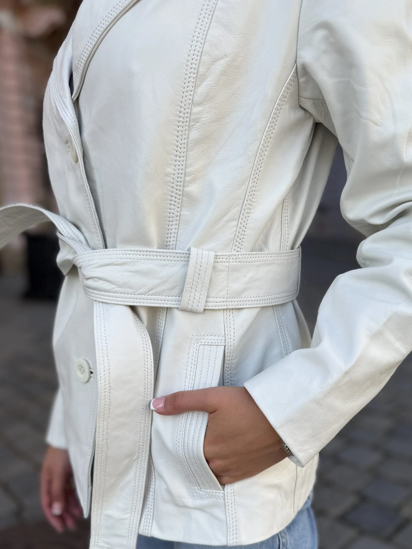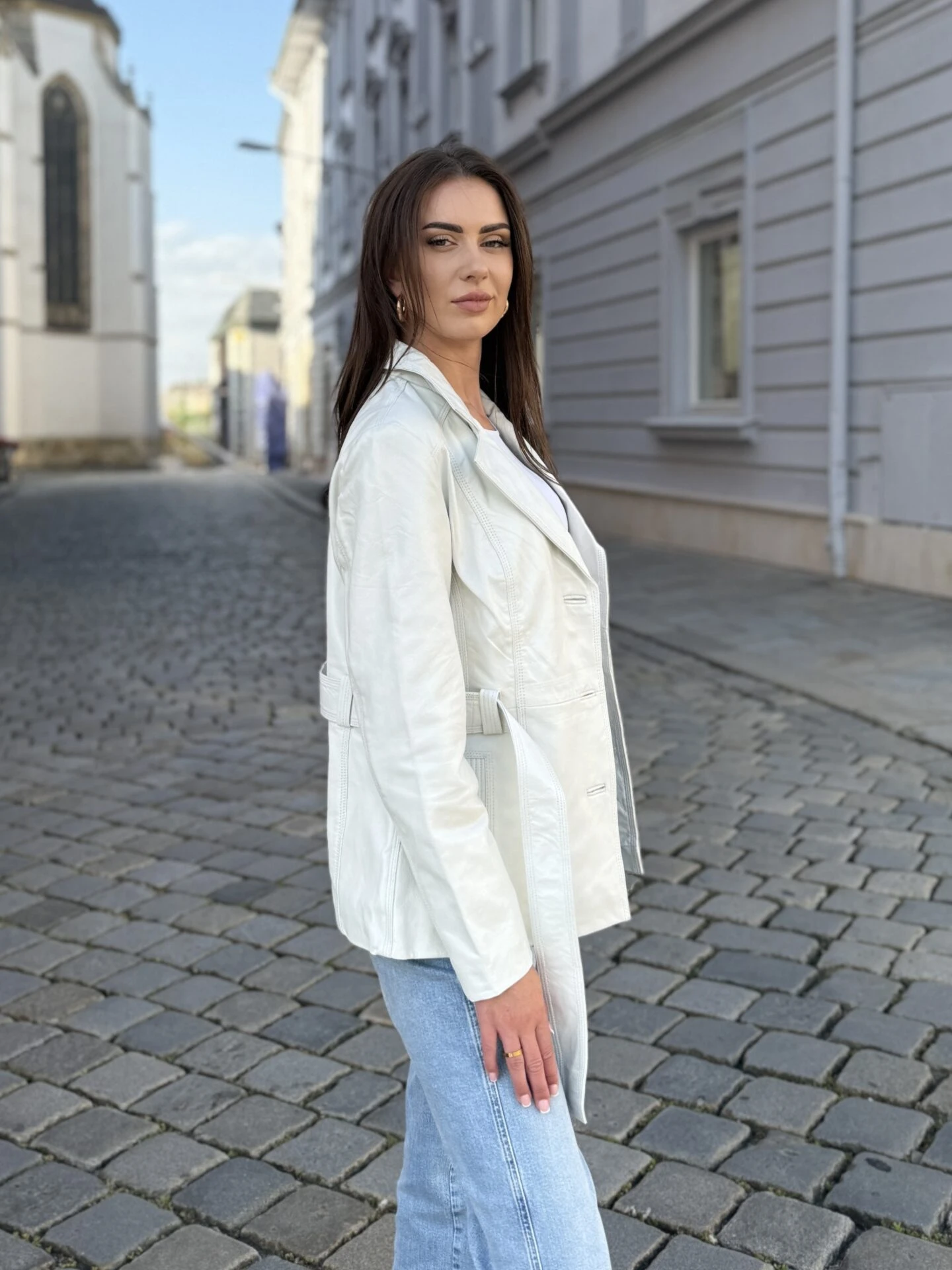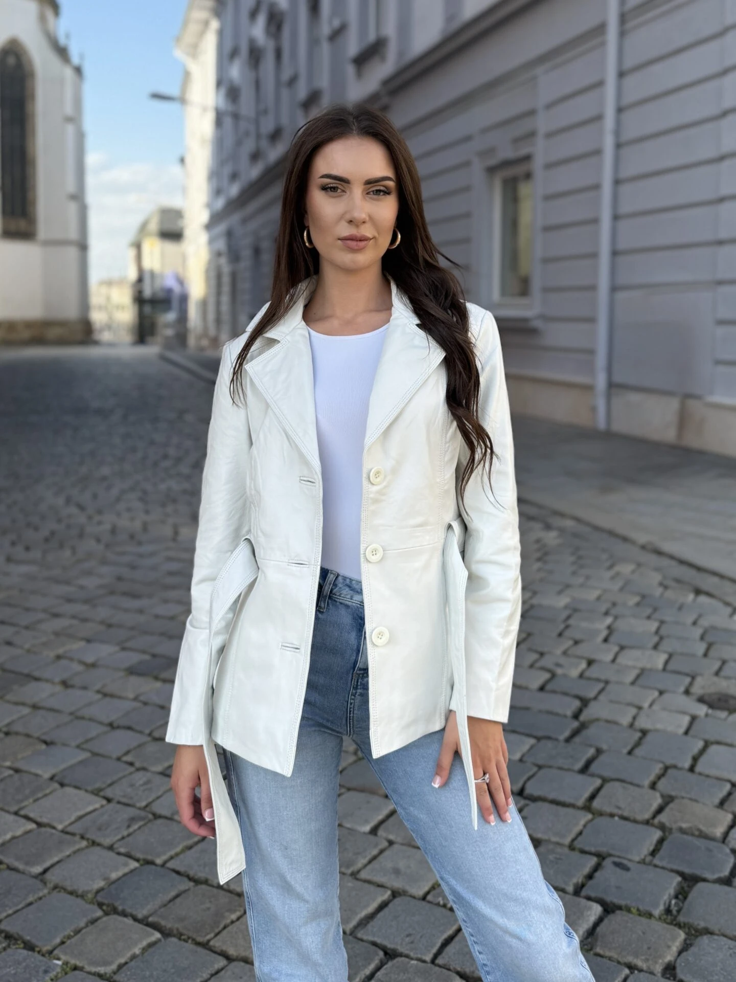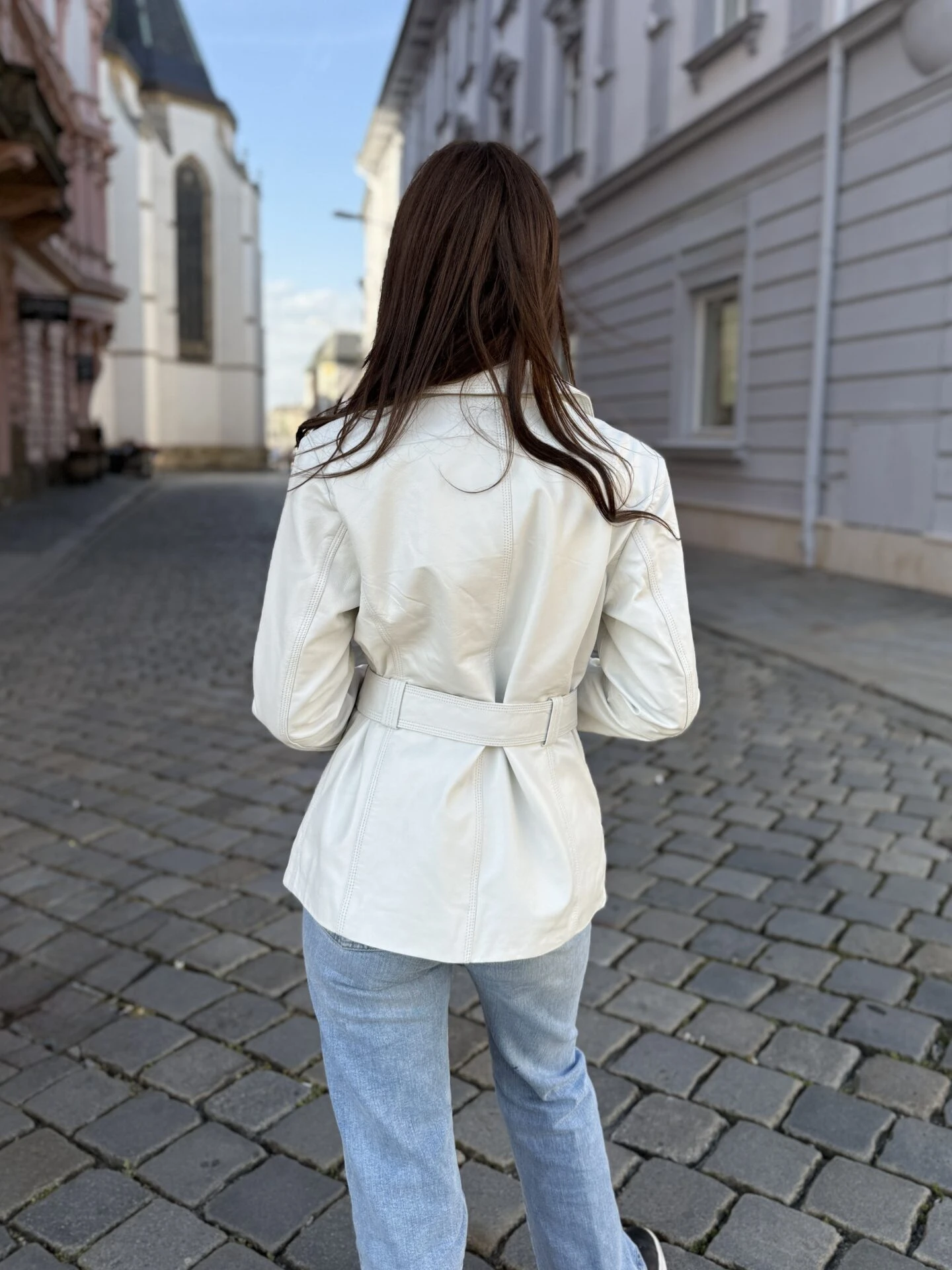 Paola White – Kožený bílý kabátek s páskem a knoflíky