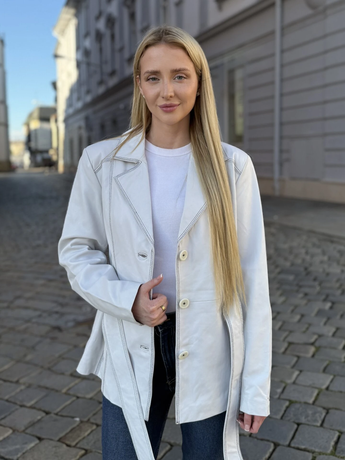 Paola White With Black Sewing – Kožený bílý kabátek s páskem a knoflíky