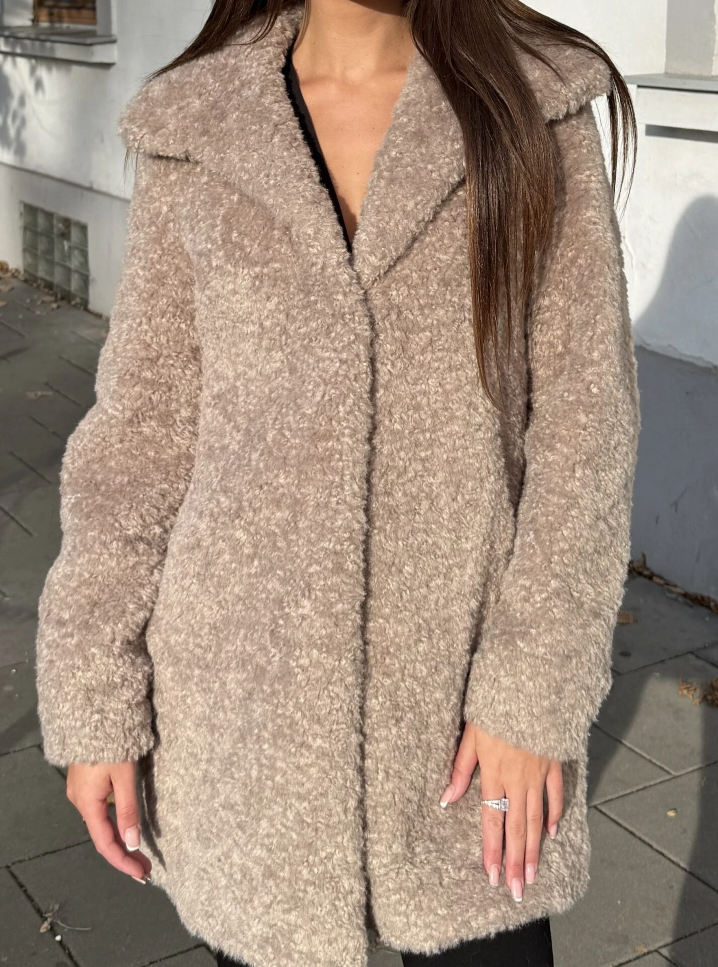 Nepravidelné kroucení vláken připomíná jehněčí vzhled a velké klopy límce dodávají kožichu ještě více charakter pravé kožešiny. Tento střihový kabát má dvě boční kapsy a zapínání na 4 cvočky.