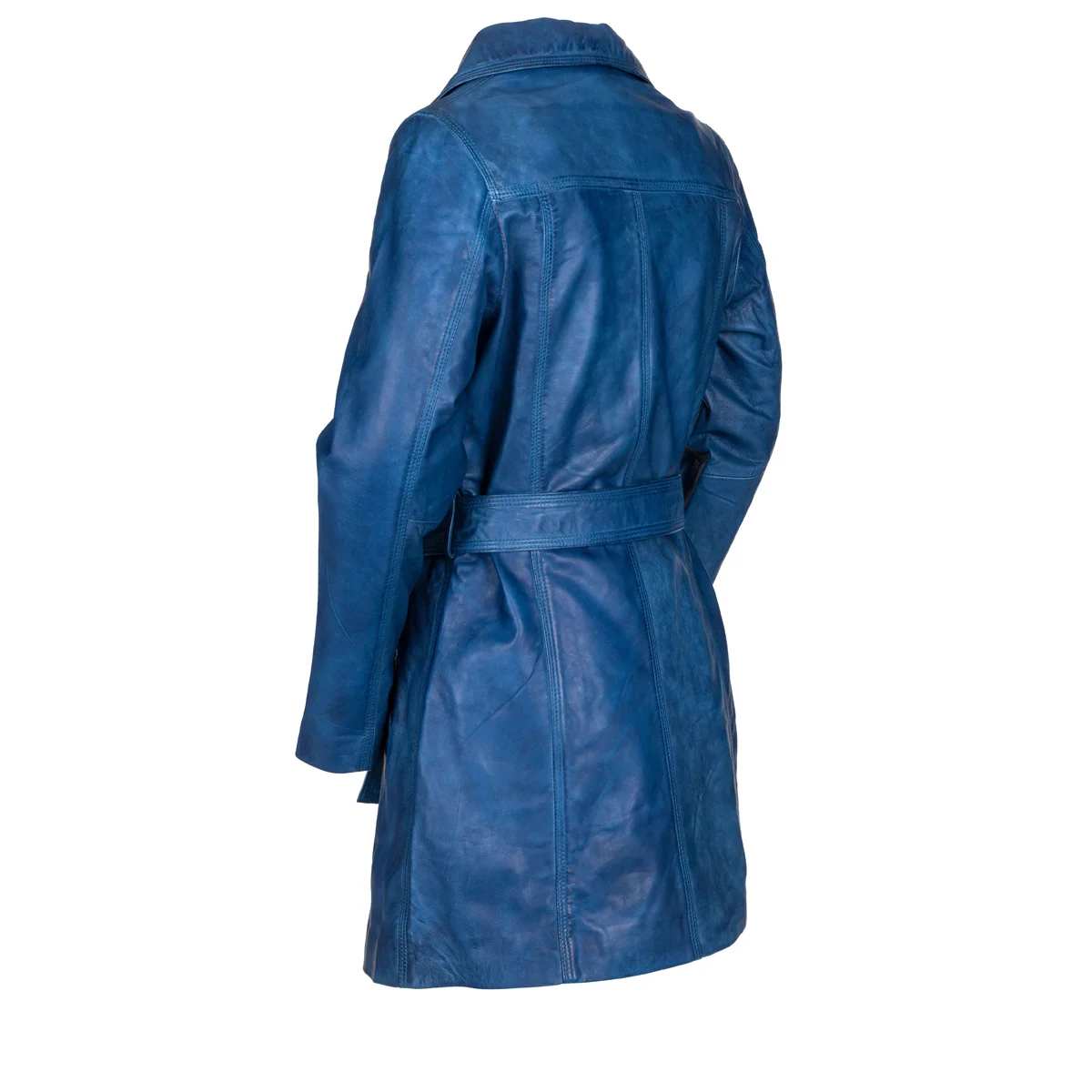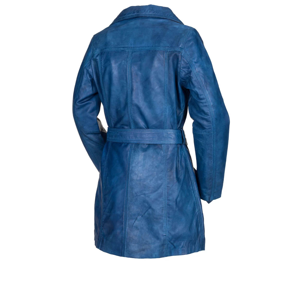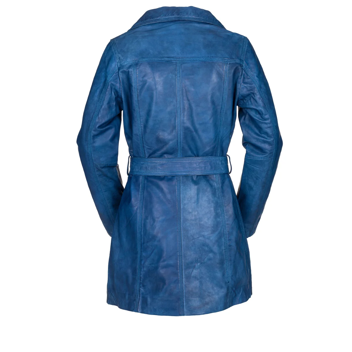 Sabine Blue Antique – dámský modrý kožený kabátek s knoflíky a páskem
