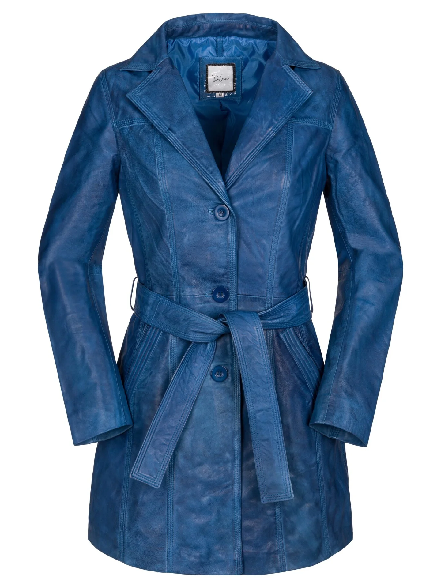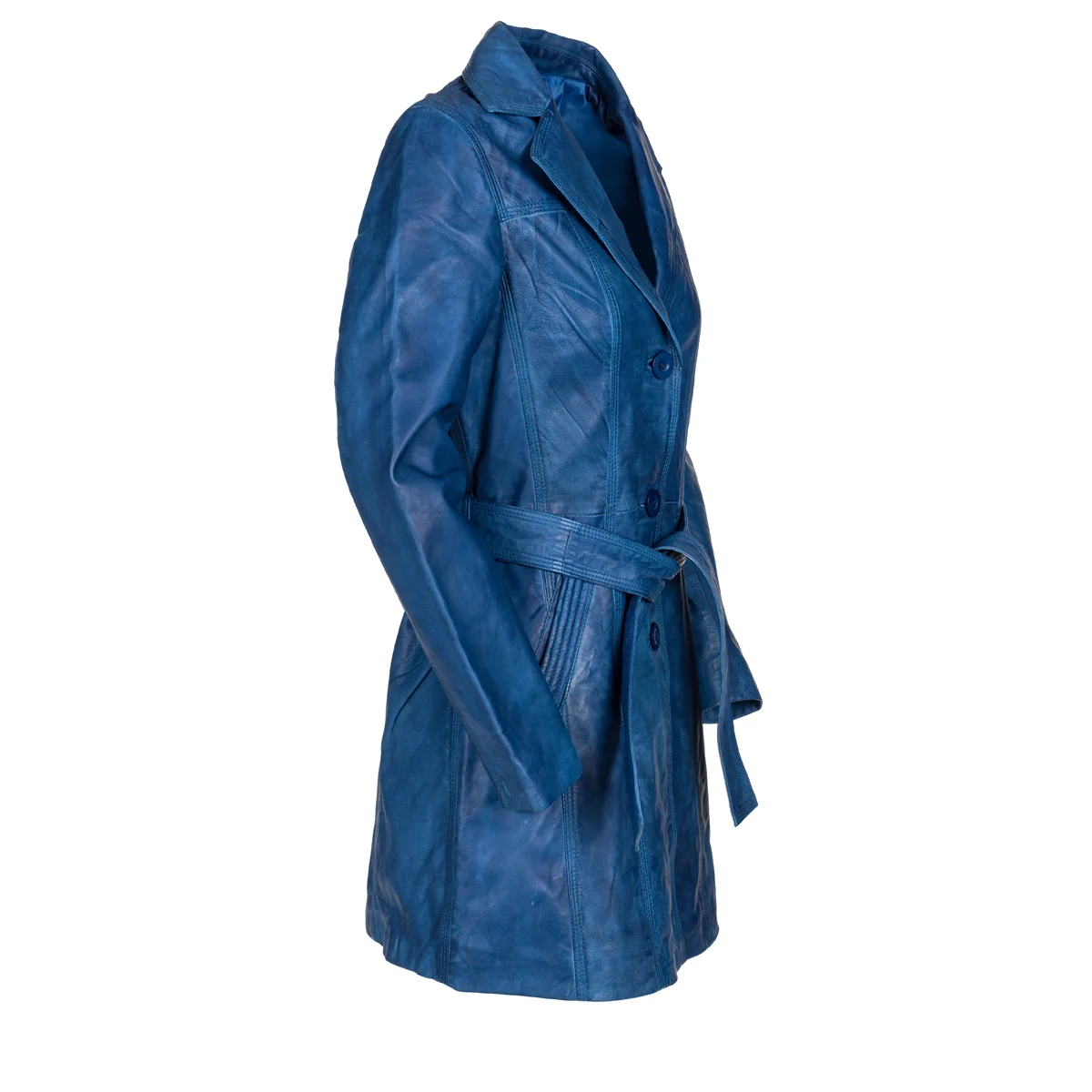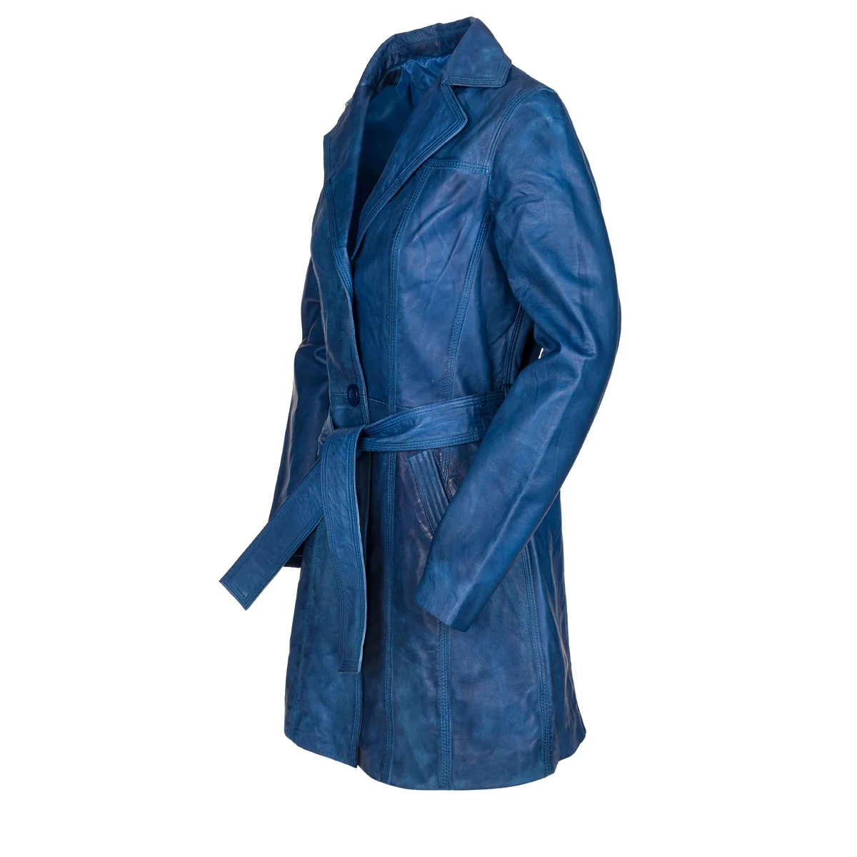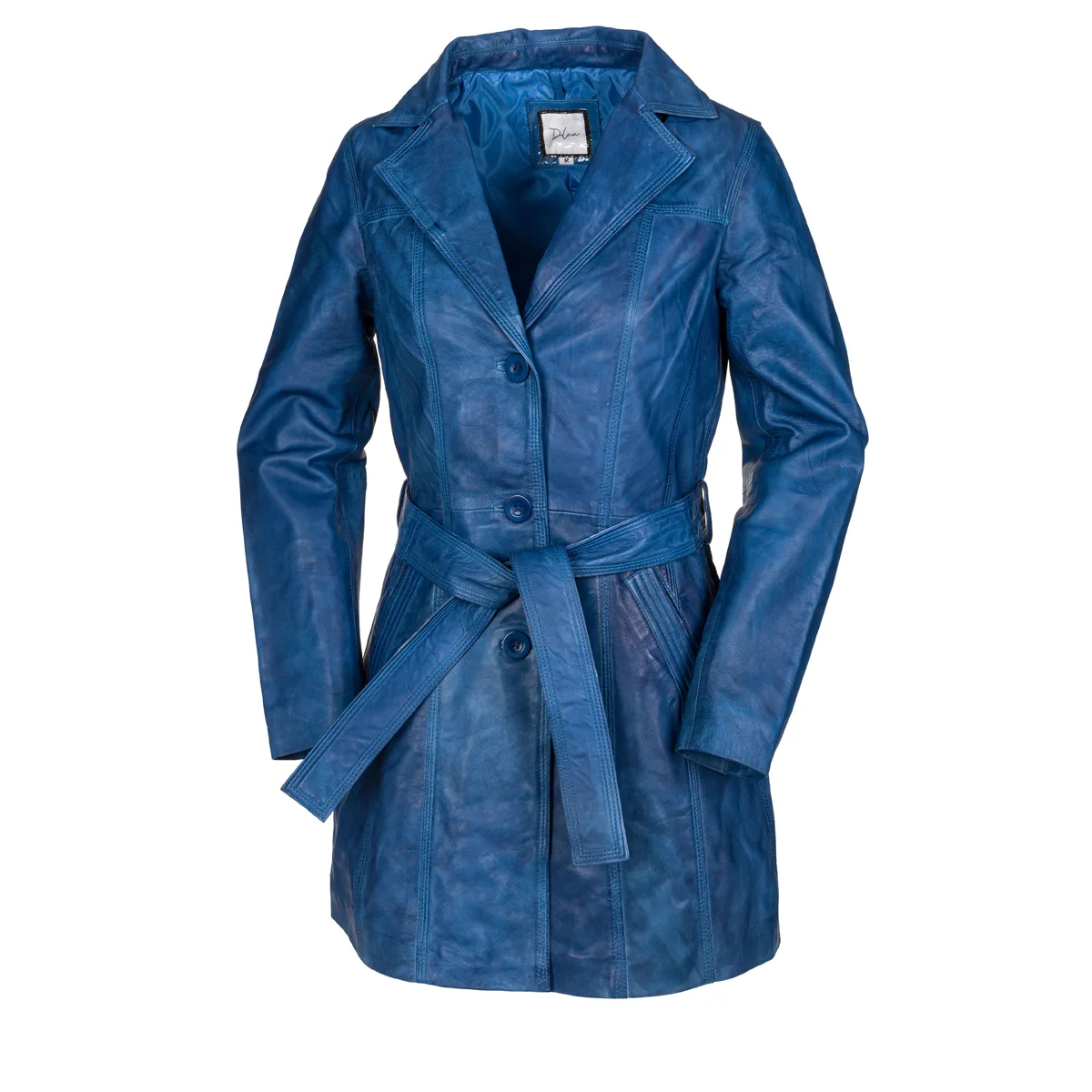 Sabine Blue Antique – dámský modrý kožený kabátek s knoflíky a páskem
