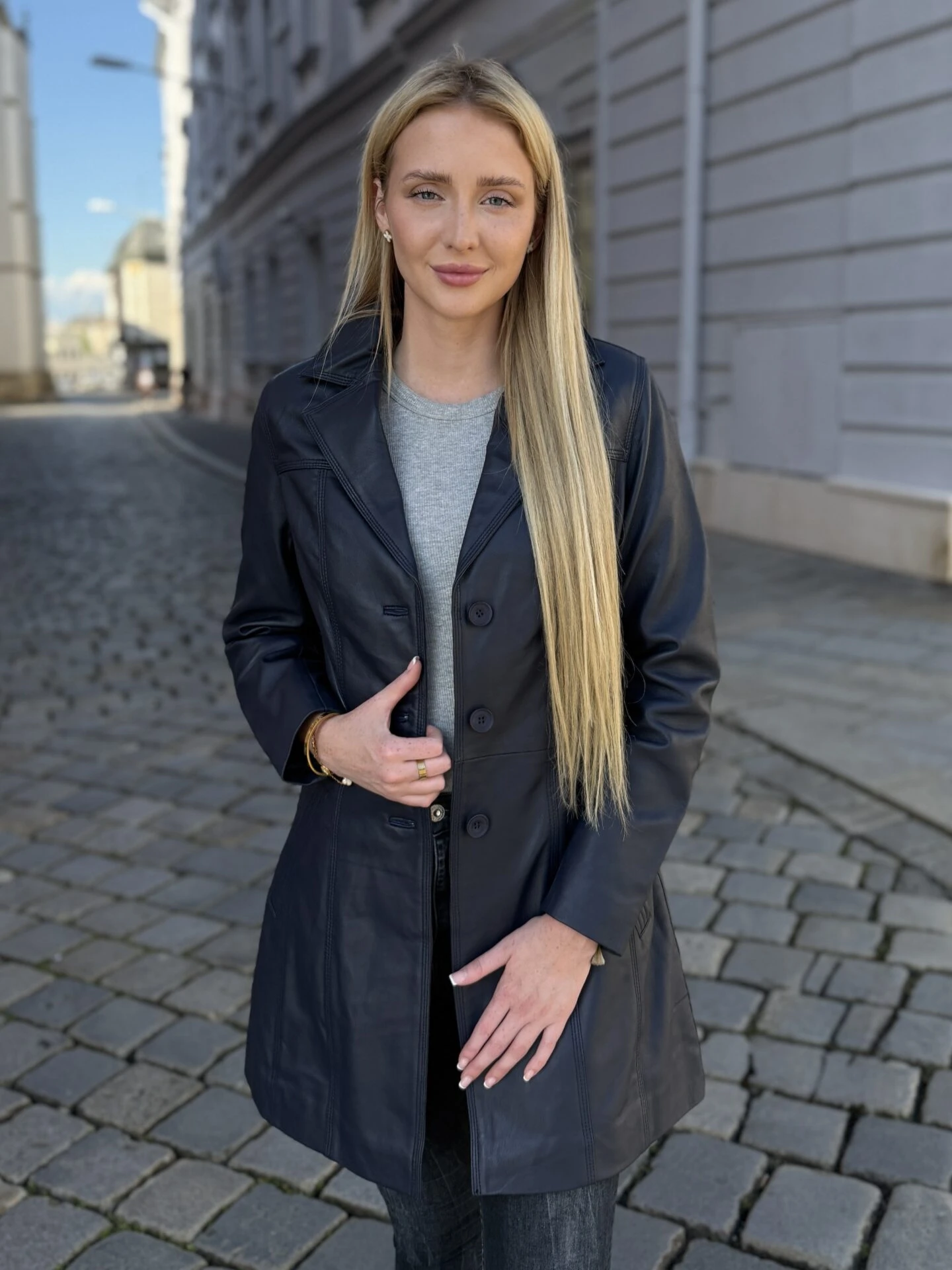 Sabine Navy Blue – dámský modrý kožený kabát s knoflíky