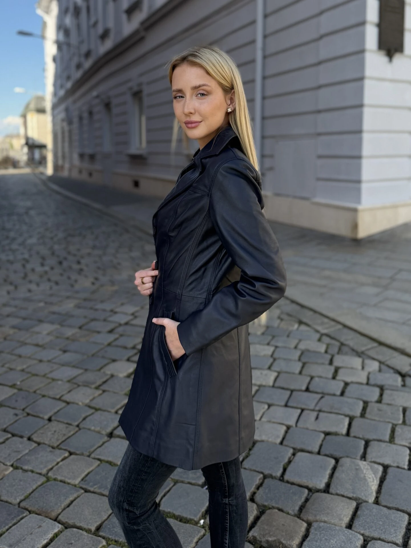 Sabine je elegantní dámský kožený kabát navržený pro ženy, které ocení nadčasový střih, pohodlí a kvalitní zpracování. Vyrobený z jemné jehněčí kůže, je měkký, poddajný a příjemný na nošení. Má klasické zapínání na tři knoflíky a dvě praktické boční kapsy, které jsou nenápadně zapracované do střihu. Mírně projmutý střih pěkně zvýrazňuje siluetu, ale zároveň poskytuje dostatek prostoru pro pohodlný pohyb.